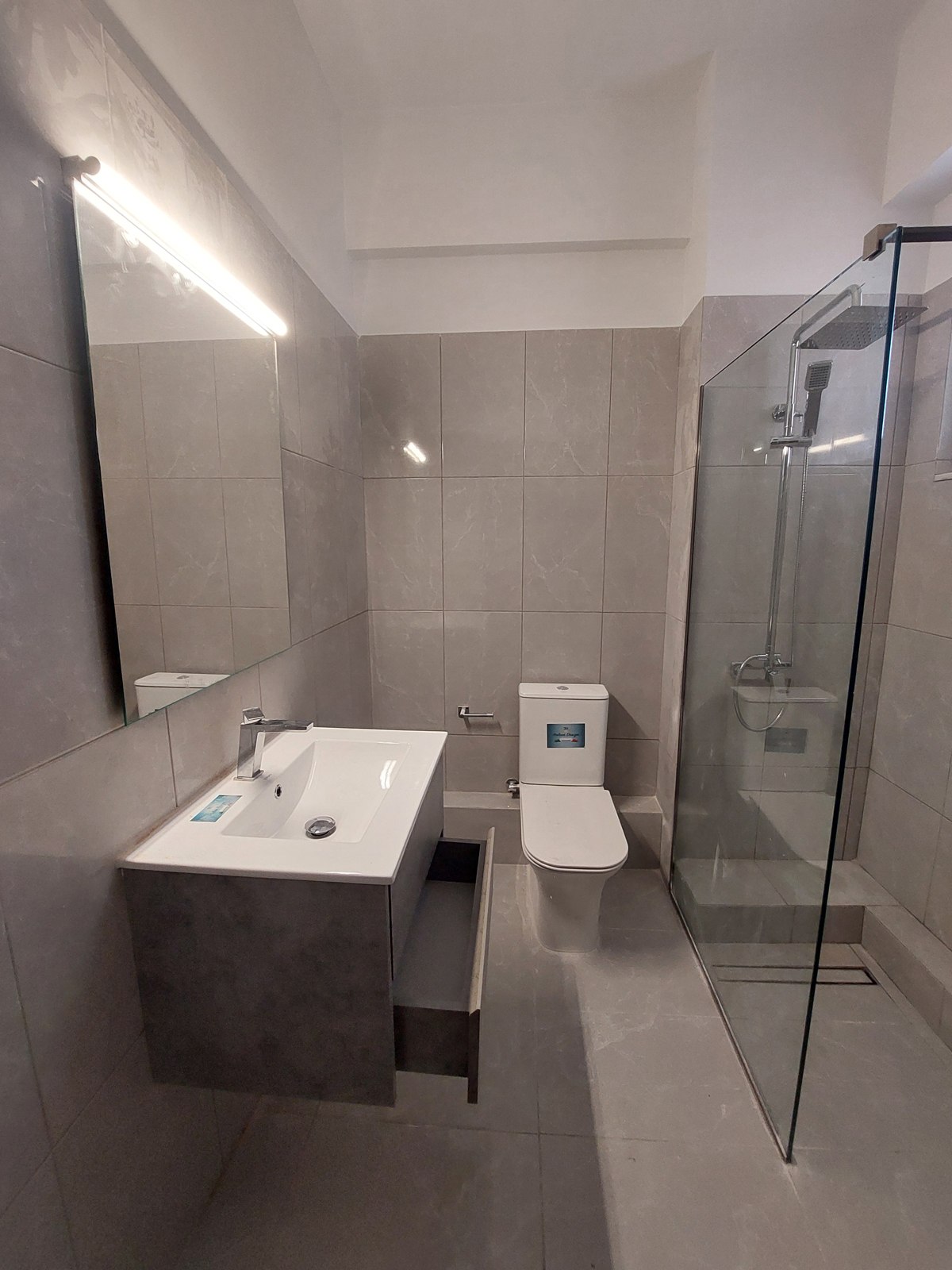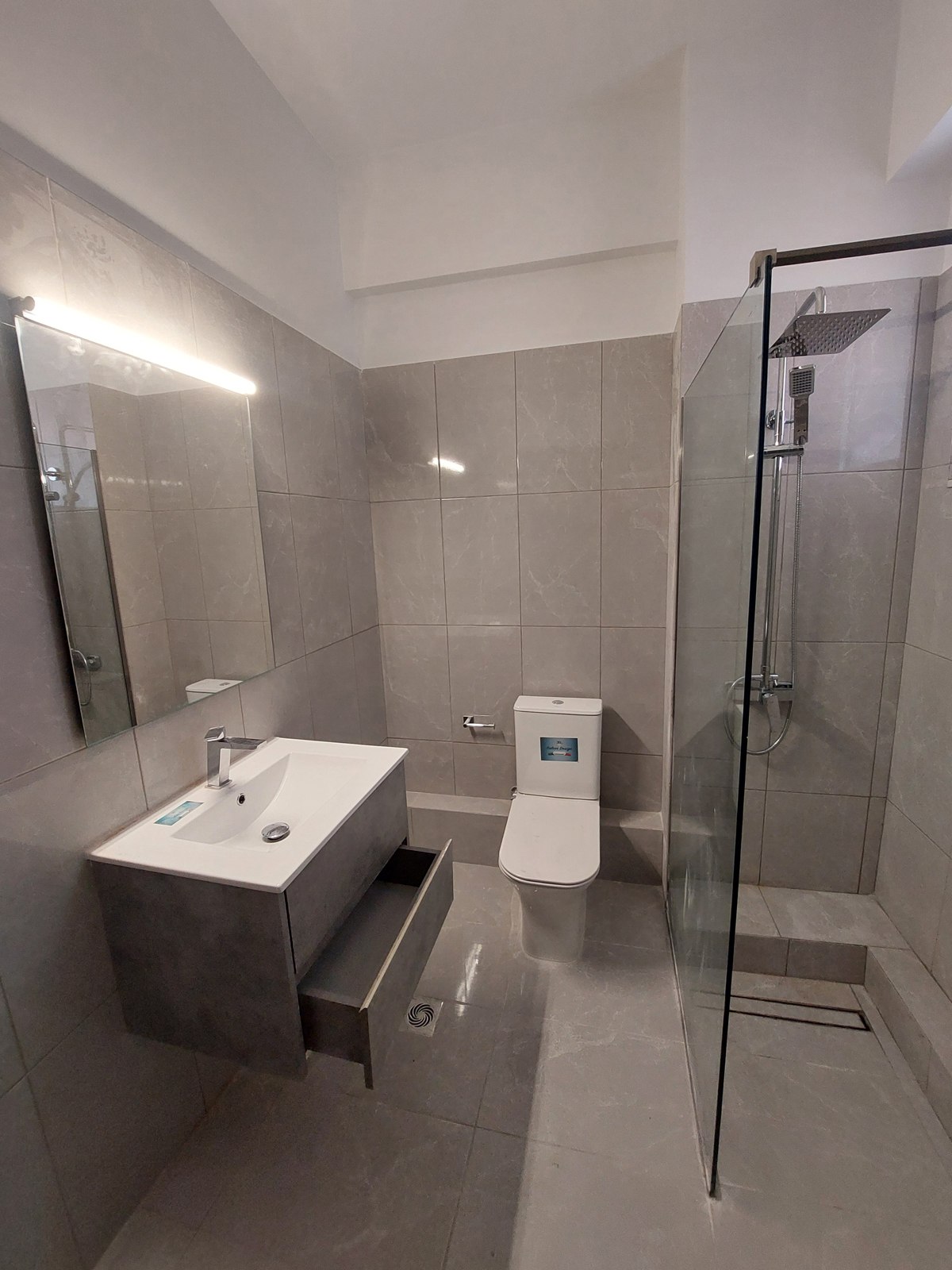 Η ανακαίνιση αφορά τον επανασχεδιασμό και τη μετατροπή ενός ενιαίου μεγάλου λουτρού σε δύο ανεξάρτητους χώρους. Η επέμβαση ακολούθησε σύγχρονη σχεδιαστική λογική, με καθαρές γραμμές και απλές συνθέσεις. Η νέα πλακόστρωση και τα επιλεγμένα είδη υγιεινής διαμορφώνουν έναν ενιαίο, μοντέρνο χαρακτήρα. Το αποτέλεσμα είναι δύο σύγχρονα λουτρά που ανταποκρίνονται στις σύγχρονες ανάγκες κατοίκησης με έμφαση στη λεπτομέρεια και τη χρηστικότητα.
