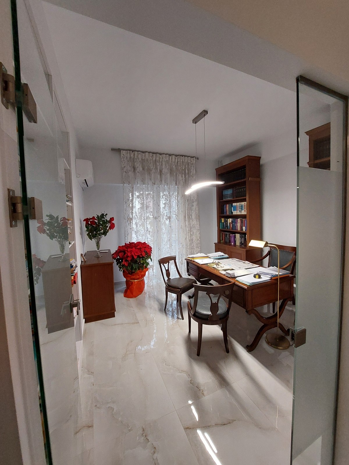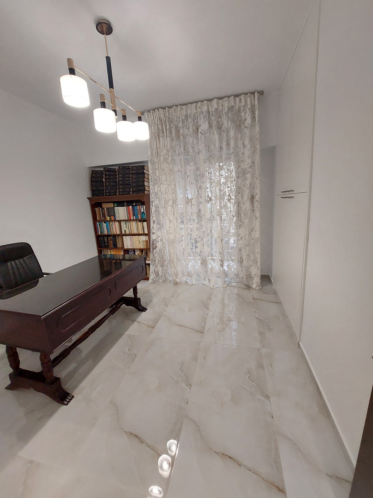 Η ανακαίνιση του δικηγορικού γραφείου στοχεύει στη δημιουργία ενός χώρου που αποπνέει κύρος και επαγγελματισμό, συνδυάζοντας κλασικά και σύγχρονα στοιχεία. Το νέο μπάνιο σχεδιάστηκε με πολυτελή υλικά και διακριτική αισθητική. Η πλακόστρωση επιλέχθηκε ώστε να γεφυρώνει το κλασικό με το μοντέρνο, προσδίδοντας διαχρονικό χαρακτήρα στους χώρους. Οι νέες πόρτες, σε κλασικούς χρωματισμούς, ενισχύουν την αίσθηση σοβαρότητας και αρμονίας. Το αποτέλεσμα είναι ένας ήρεμος, σύγχρονος χώρος που αποπνέει κύρος και επαγγελματισμό.